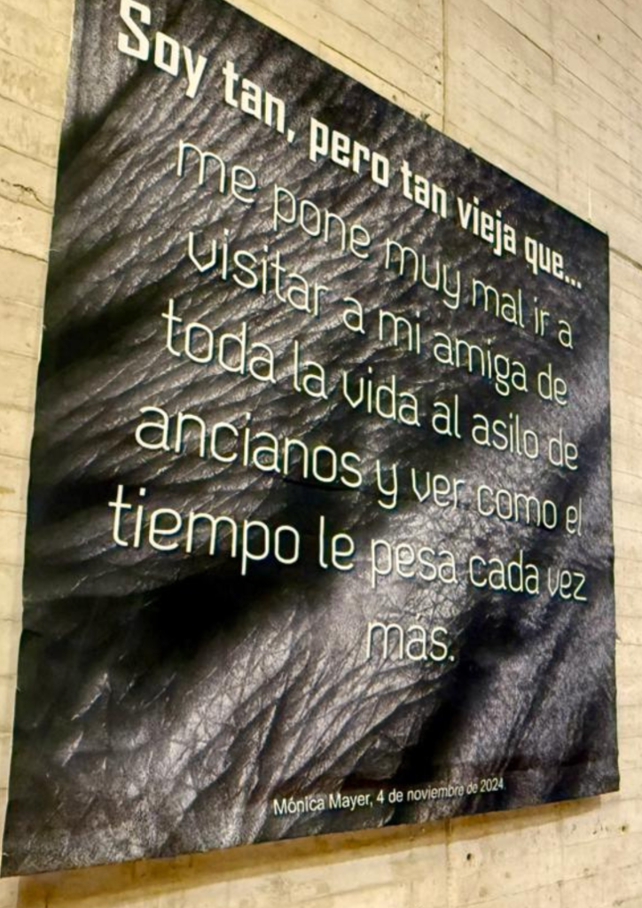 La obra Soy tan, pero tan vieja es una propuesta participativa que aborda la vejez y sus narrativas cotidianas a través de frases escritas por la propia artista y por el público.