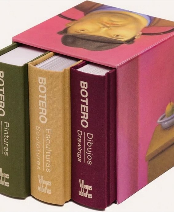 La colección botero la componen tres libros de pequeño formato (10.5 x 10.5 cm) con carátula en tela estampada, contenidos en un fino estuche forrado en seda impresa, repujado, que recogen lo mejor de su pintura, escultura y dibujo, conformando un objeto íntimo, elegante y un regalo especial. Reúne, en versión completa y bilingüe (español-inglés) de sus excelentes textos, tres obras fundamentales publicadas originalmente por Villegas editores en gran formato en 1997, 1998 y 1999, hoy totalmente agotadas.
