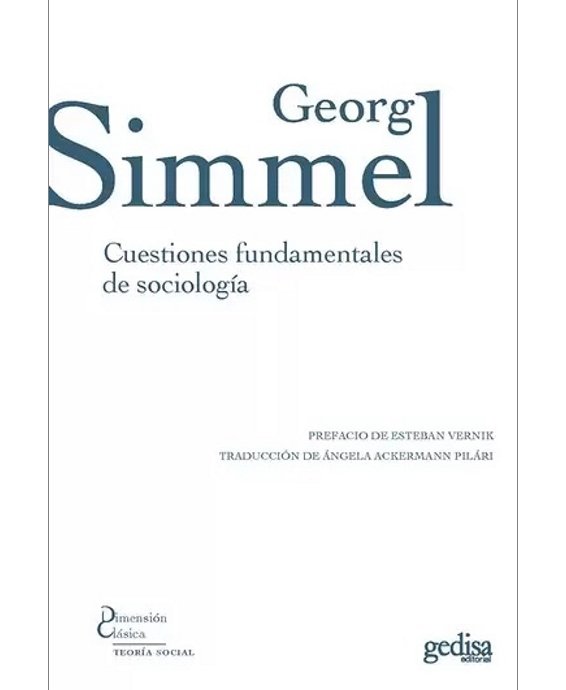 En Cuestiones fundamentales de la sociología, texto hasta ahora inédito en castellano, Simmel sitúa el campo de investigación de esta disciplina como el espacio intermedio donde se produce el constante fluir de la interacción social, donde los encuentros generan actitudes y rituales, tanto en situaciones previstas como casuales y espontáneas. Es por ello que Simmel incluye en su perspectiva sociológica fenómenos hasta ese momento desatendidos, como el secreto, el amor, la amistad, el adorno, el vestir, los perfumes, la hostilidad, la hospitalidad, la fidelidad y la gratitud. Al evitar el estilo científico académico, Simmel crea un nuevo tipo de ciencia, que partiendo de una interrogación epistemológica y ontológica es capaz de proporcionar estructuras cognitivas sólidas acerca de las formas empíricas de lo social. De ahí que su «sociología formal» desemboque en una «sociología filosófica», desde la que plantea tres grandes oposiciones no superadas: entre individuo y sociedad, entre libertad e igualdad y entre socialismo e individualismo. Integrar estos contrastes en una síntesis es la gran tarea del futuro.