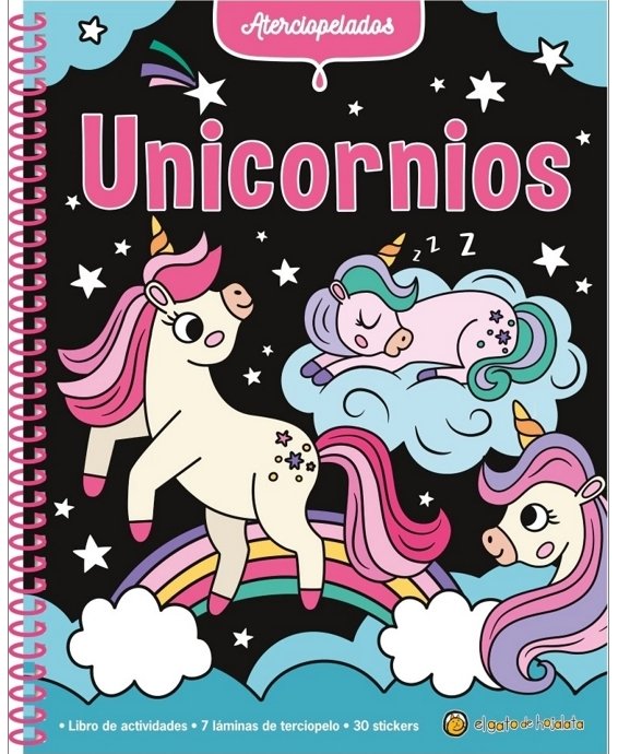 UNICORNIOS (ATERCIOPELADOS) Esta novedosa colección tiene 15 páginas de actividades divertidas y para colorear. Además, tiene 7 hermosas láminas ilustradas de terciopelo para decorar y una plancha con 30 stickers holográficos
